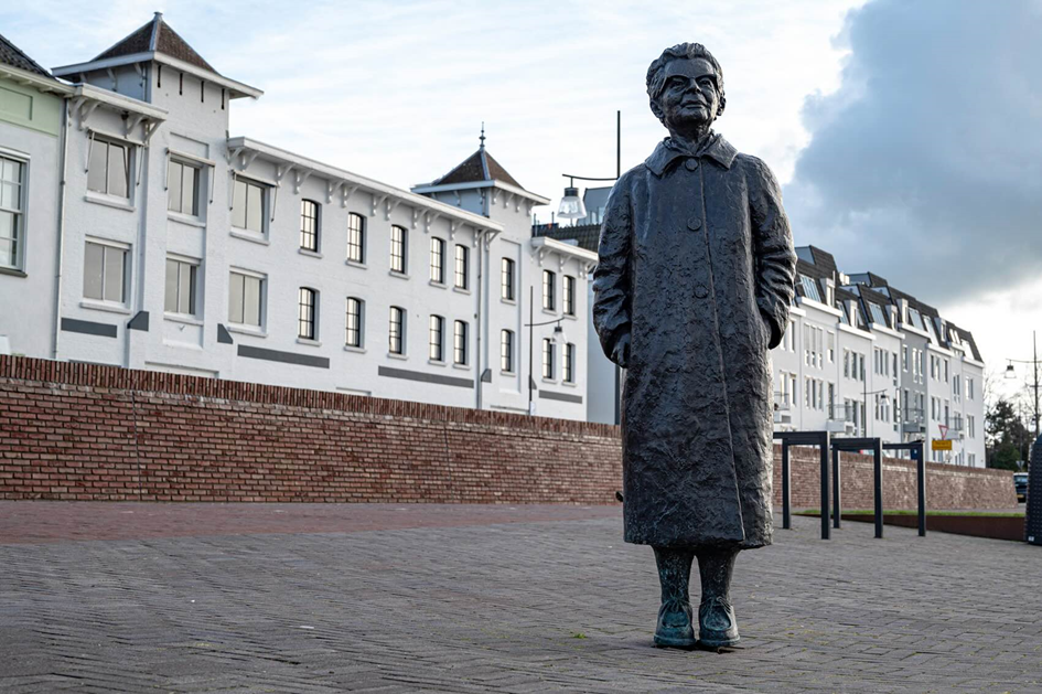 Bronzen beeld van Ida Gerhardt, uitkijkend over de IJssel bij Zutphen. Door Herma Schellingerhoudt