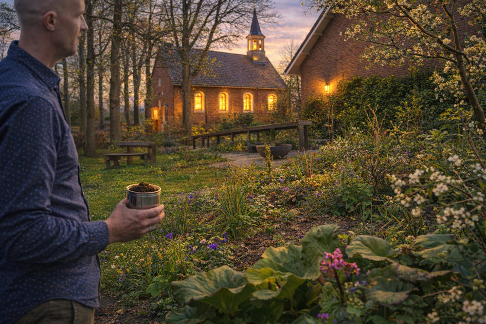 Want dat was het thema die ochtend. Ik vroeg me af waar die aarde vandaan kwam. Zou Harm de aarde voor het verhaal over de hof van Eden uit Genesis die ochtend uit het bloementuintje naast het Loughoes gehaald hebben? Op dezelfde manier als we het water, dat we gewoon uit de kraan halen, in het doopvont betitelen als water dat rechtstreeks uit de Jordaan via het Eelderdiepje onder de kansel de kerk binnenstroomt?